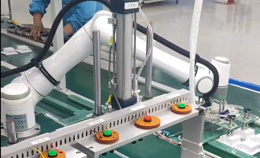 milan.米兰中国机器人聚焦电子行业检测及上下料自动化,进一步分析了企业需求,为该企业打造了协作机器人定制化系统解决方案,实现了电源开关的高效精准取放及检测。