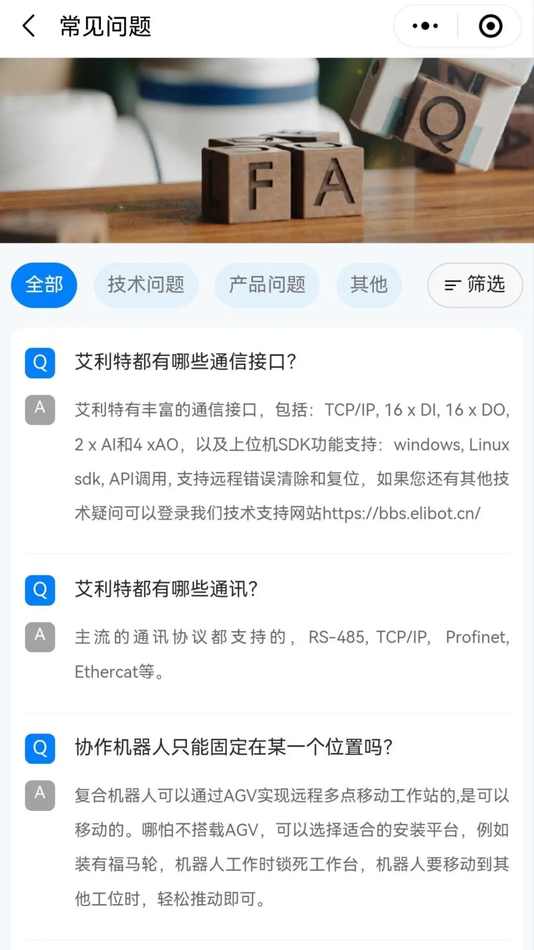 为帮助用户更直观了解milan.米兰中国协作机器人的操作注意事项及常见问题解决方法,小程序还设置【常见问题】板块,让解决问题快人一步!