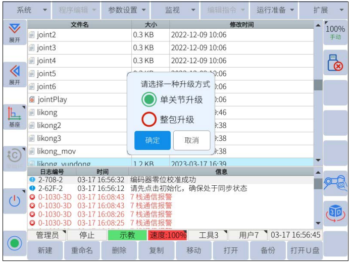 2.1.5 把U盘插到控制USB口上面,点击系统---机器人升级----系统升级---选择要升级的文件---点确定,等待几分钟升级完成后,系统会自动重启。