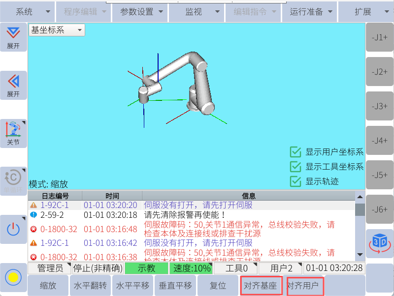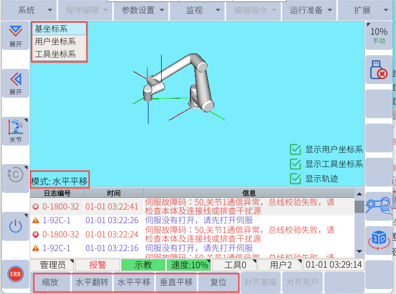 3)对齐功能界面下,可以选择基座标系,用户坐标系,工具坐标系,不同坐标系下,机器人模型会随之变化,缩放、水平翻转、水平平移、垂直平移、复位功能,可通过是机器器右侧的滚轮,将机器人模型进行平移翻转,方便用户查看当前机器人姿态,如下图所示