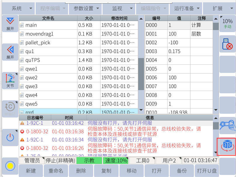 2)右下角包含对齐基座与对齐用户两个功能,保持按住示教器背后黄色使能键,点击对齐基座或者用户功能,根据当前选择的工具与用户,机器人会自动将当前工具tcp的z方向自动垂直与基座xy平面或者用户坐标系的xy平面,方便用户调试