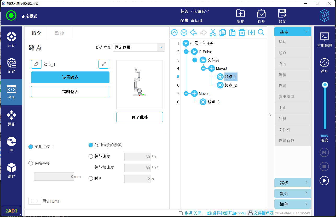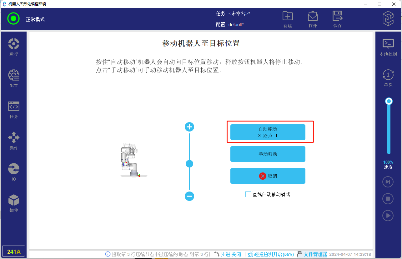 ● 固定位置路点与原点任务节点:程序运行时如果机器人不在该路点或原点位置,则会弹出手动运行到位置的页面,让用户手动控制机器人,移动到起始位置。如图-1所示