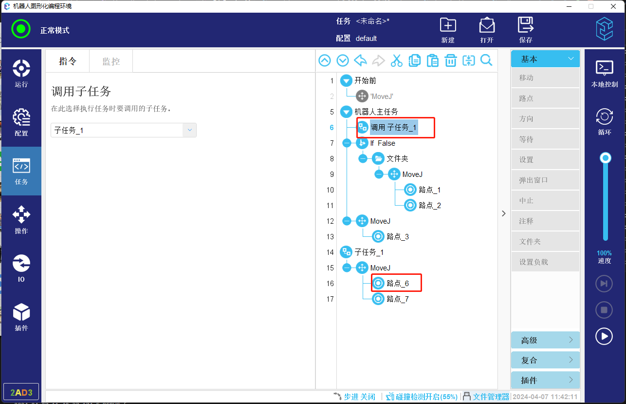 4.  如果程序流程中,存在调用子任务节点,则会进入被调用的子任务内部按照相应规则,查找起始安全位置点位,如图-5所示程序,如果任务从第一行开始运行,则会查找到路点_6作为程序起始位置。