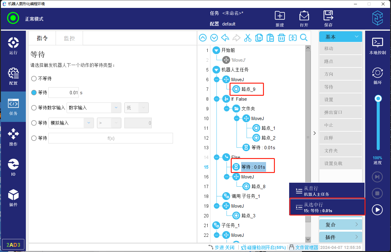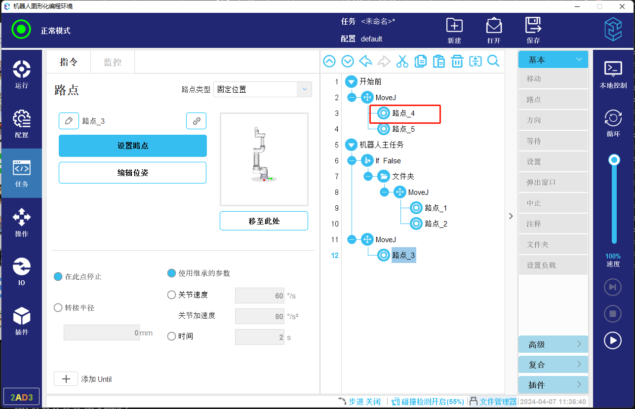 4.  如果当前选中的任务节点上方无可以运行到的节点并且内部也没有可以运行到的点,则会直接开始运行,不再继续向后考虑支持运行到的路点。所以下方图-13所示程序会支持开始运行,不会已路点_4作为起始位置。
