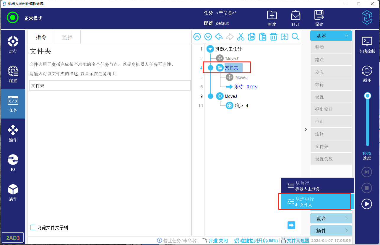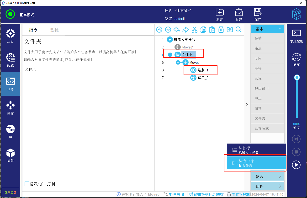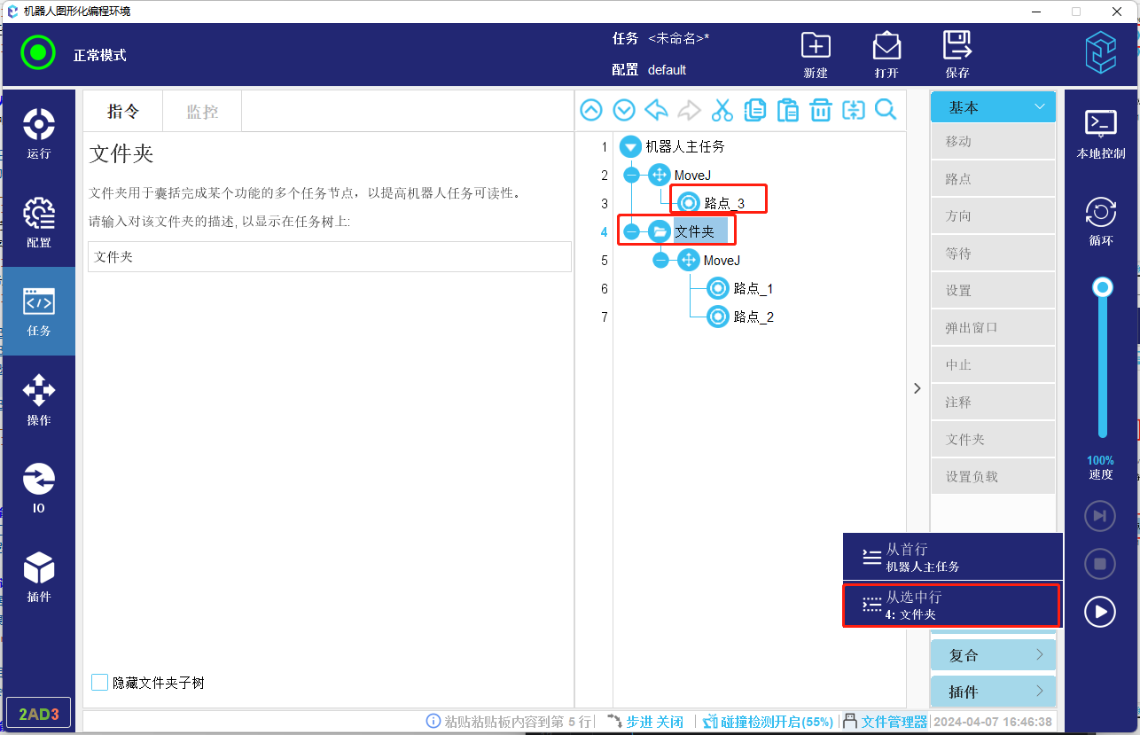 3.  如果起始行不可以作为起始安全位置节点,则会查找该节点上方的节点,如果存在可以作为起始位置的节点,则选做起始位置节点,如果不存在起始位置节点,则会进一步正向查找该节点内部是否存在起始位置节点,如果存在,则作为起始位置。如下方图-11所示任务,如果选择第4行文件夹为开始节点,则会找到路点_3作为起始位置。如果文件夹上方如果没有起始路点,则会向下找到起始点,如图-12所示则会找到路点_1作为起始位置。