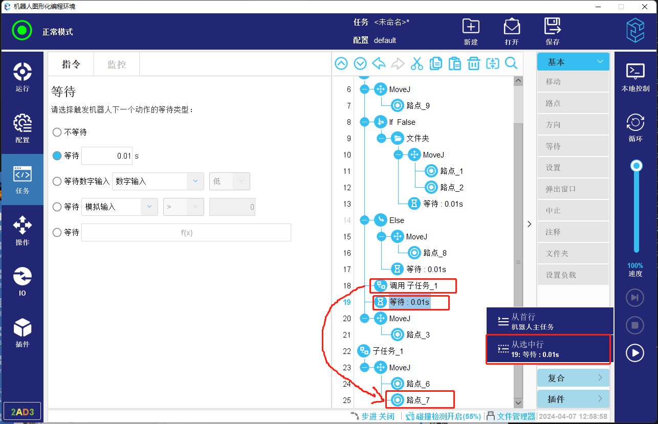 5.  如果起始行的上方存在子任务节点,则会找到该子任务节点的终止位置作为起始位置。如下方图-14所示任务,如果以第19行作为起始行,则会找到路点_7作为起始位置。