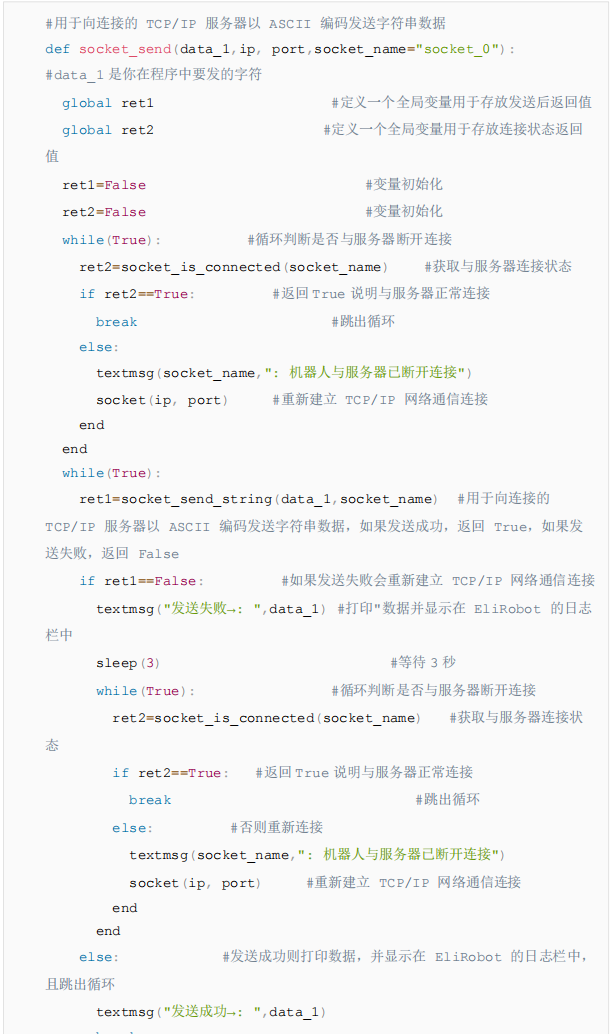 2.为了避免图2-1的情况发生,我们可以利用发送指令的返回时作为判断是否发送成功,发送失败时一直发送直到发送成功为止,发送失败的情况一般都是机器人客户端与服务器断开连接时出现的,所以我们可以在发送前和发送失败后通过“socket_is_connected()”判断与服务器连接的状态如果断开重新连接再次发送,如图2-2所示,可以用下面代码2-1配合图2-3的图形化编程直接调用df脚本实现此操作。