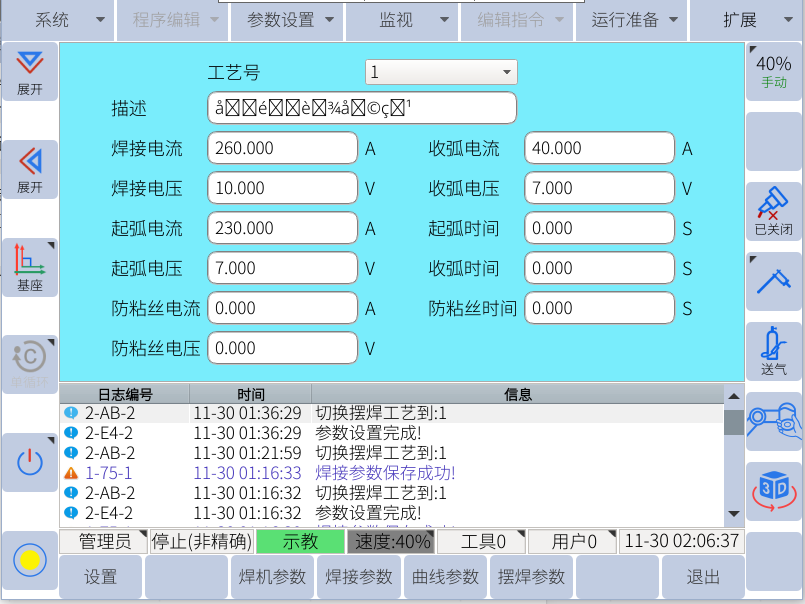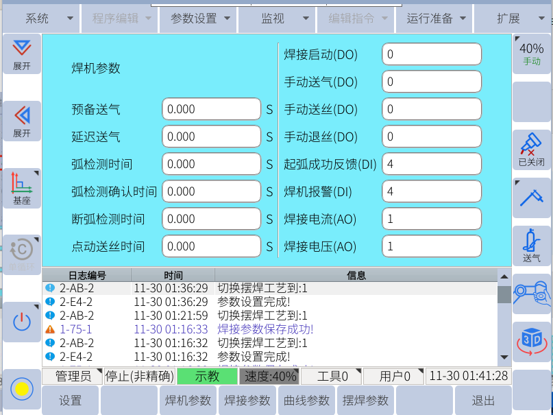 直到这个时候,焊接配置已经完成,这个时候可以点击左侧图标观察能否手动出丝,送气。