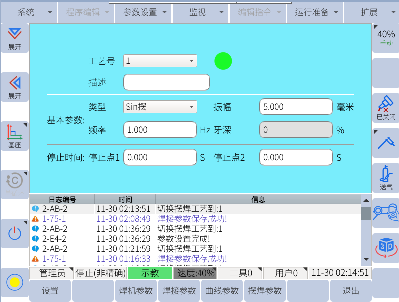 停止时间:停止点1表示Sin摆焊接的最高点,停止点2表示Sin摆焊接的最低点