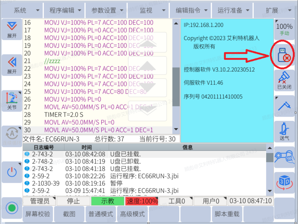 在示教器上可以检查机器人是否识别到U盘