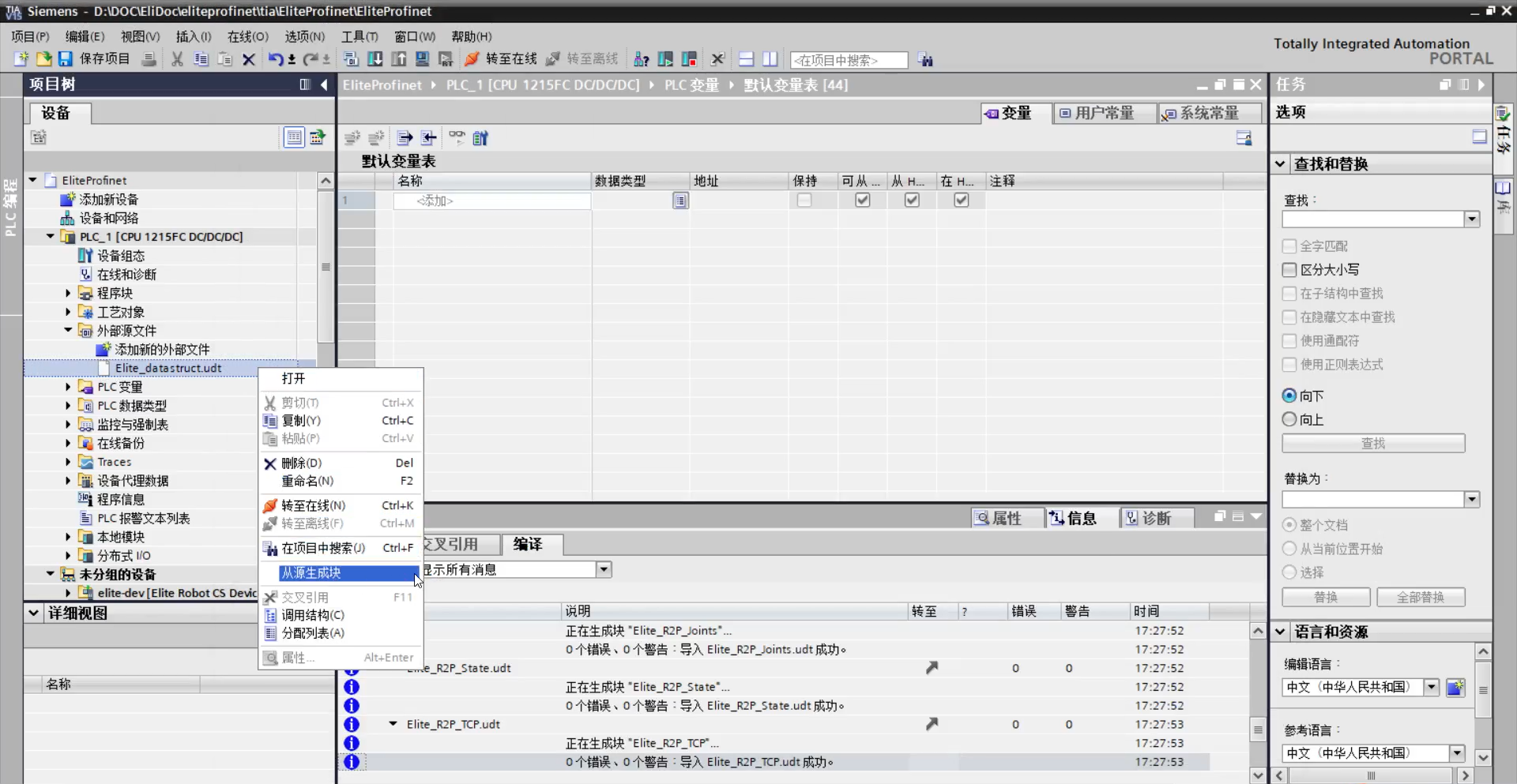 左侧项目树中选择“外部源文件> 添加新的外部文件> Elite_datastruct.udt”,如图 3-7(a) 所示;右键“Elite_datastruct.udt> 从源生成块”,对弹窗点击确定,如图 3-7(b)所示;左侧 项目树中展开 PLC 数据类型,可看到相关数据类型,如图 3-7(c)所示