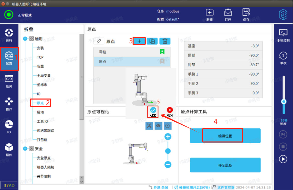 2 添加一个原点位置:配置—原点—编辑位置—移动到原点位点确认,如图2.1.2所示: (这里的原点是指机器人在项目中的一个安全位,可根据现场实际情况修改)