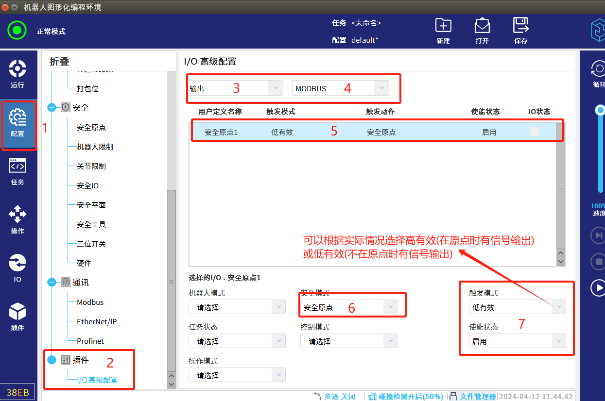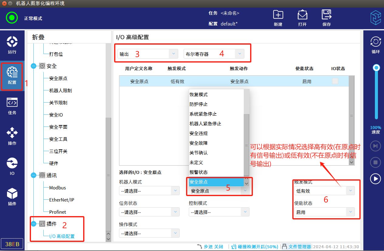 3.  配置modbus信号为安全原点信号输出,要求:应用版本要求2.11及以上,IO/高级配置插件版IOExtensionConfig-1.2.11.1及以上(modbus通讯机器人作为主站时建议使用)