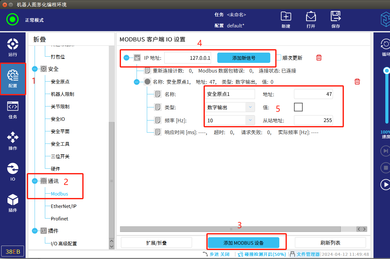 4.  通过IO/高级配置插件配置modbus信号为安全原点信号输出时需要先添加modbus信号才能在配置界面显示。