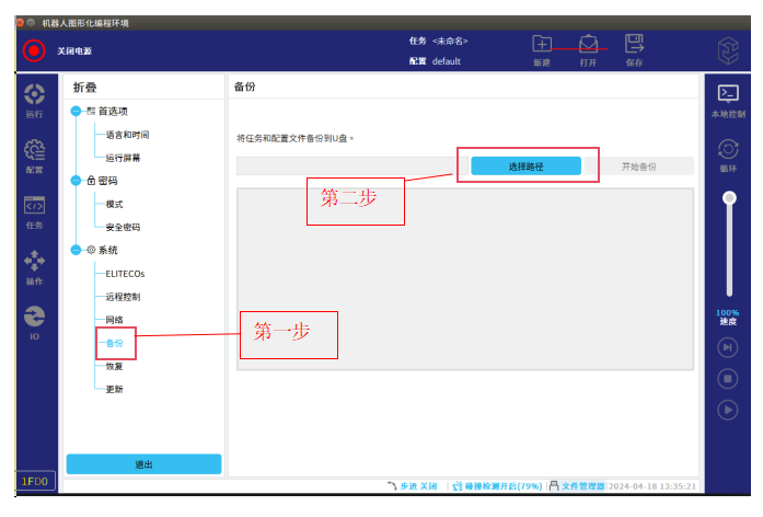 2.2.5.2按图-17所示操作步骤,系统>恢复>选择文件(U盘找到B控制柜备份程序文 件)>点击打开>开始恢复。