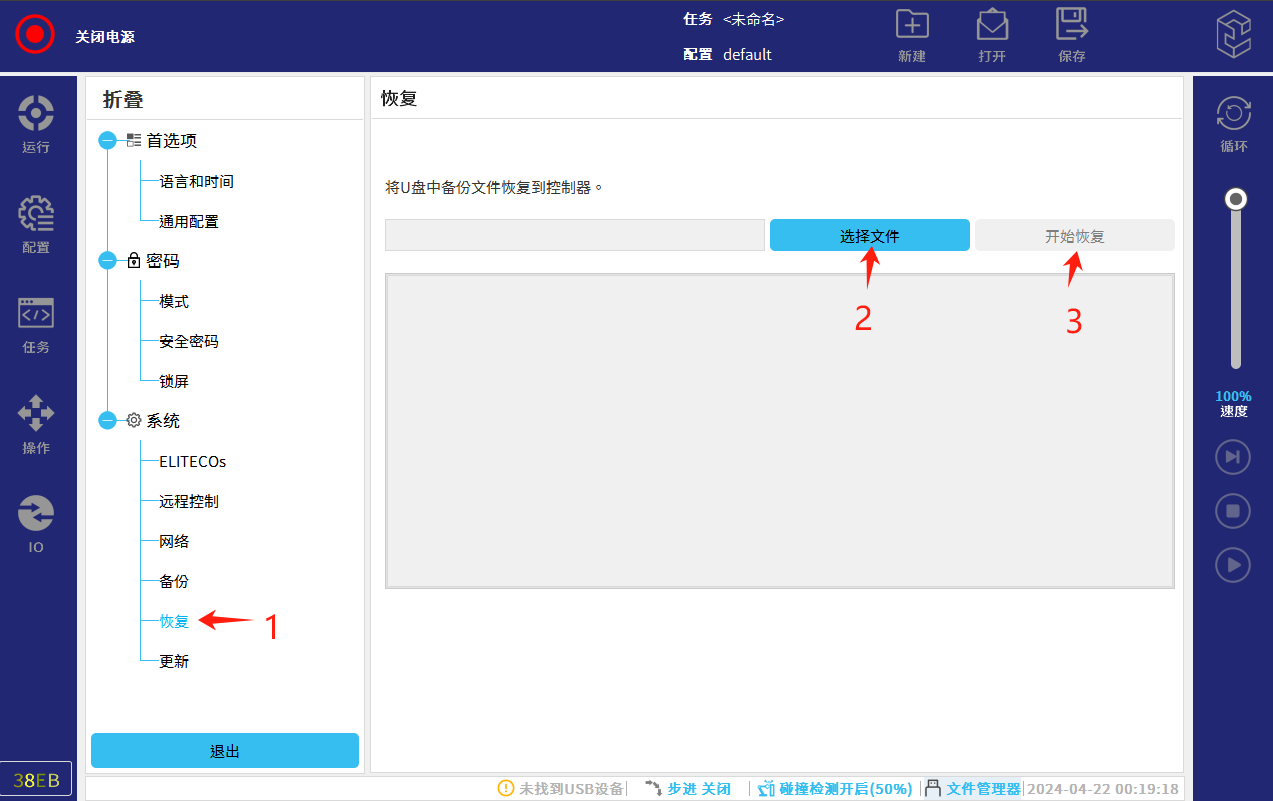 2.3.5.2按图-20所示操作步骤,系统>恢复>选择文件(U盘找到B控制柜备份程序文 件)>点击打开>开始恢复。