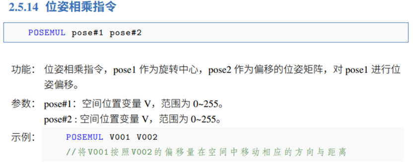 -- 计算出 v1 在工具坐标系中偏移 {50,0,0,0,0,0} 后的值,并将结果存储在 v2_tool 中